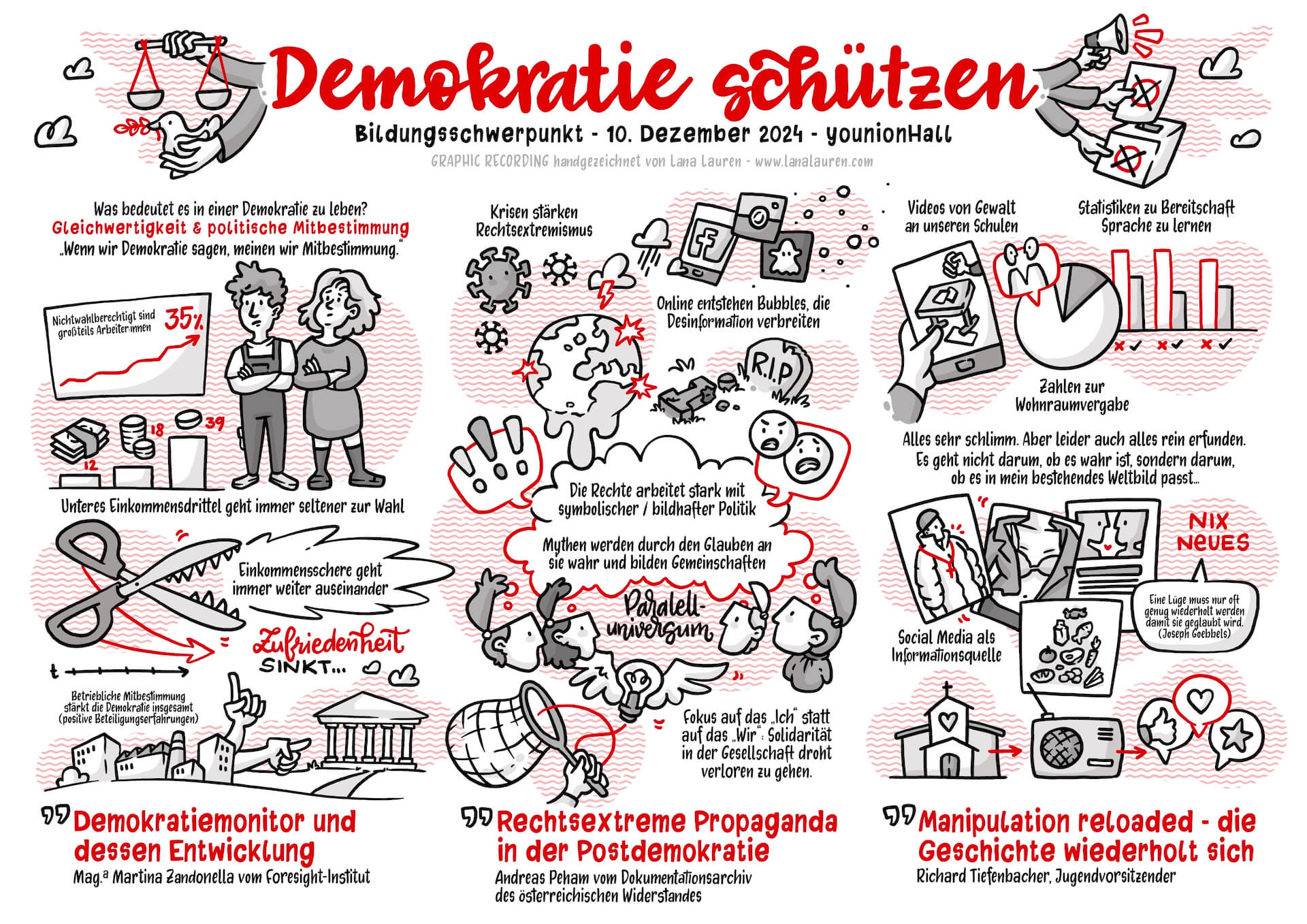 Am Event „Demokratie schützen“ durfte ich die inspirierenden Vorträge und Diskussionen mit meinem Graphic Recording visuell festhalten. Die Veranstaltung bot spannende Einblicke in die Herausforderungen und Chancen für demokratische Prozesse in Österreich und Europa.