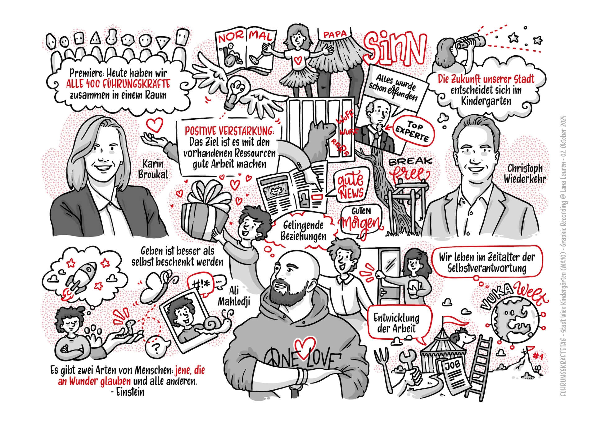 Der Tag begann mit einem Come Together bei einem gemütlichen Frühstück, gefolgt von der Eröffnung durch Karin Broukal (Abteilungsleiterin der Wiener Kindergärten) und Vizebürgermeister Christoph Wiederkehr. Ali Mahlodji begeisterte mit seiner Keynote in der er viele Denkanstöße zum Thema Führung gab und uns alle daran erinnerte, dass gelingende Beziehungen sowie der Fokus auf positive Verstärkung der Schlüssel zum Erfolg sind. Diese kraftvollen Botschaften habe ich live in Bilder übersetzt und die wichtigsten Punkte für alle festgehalten.