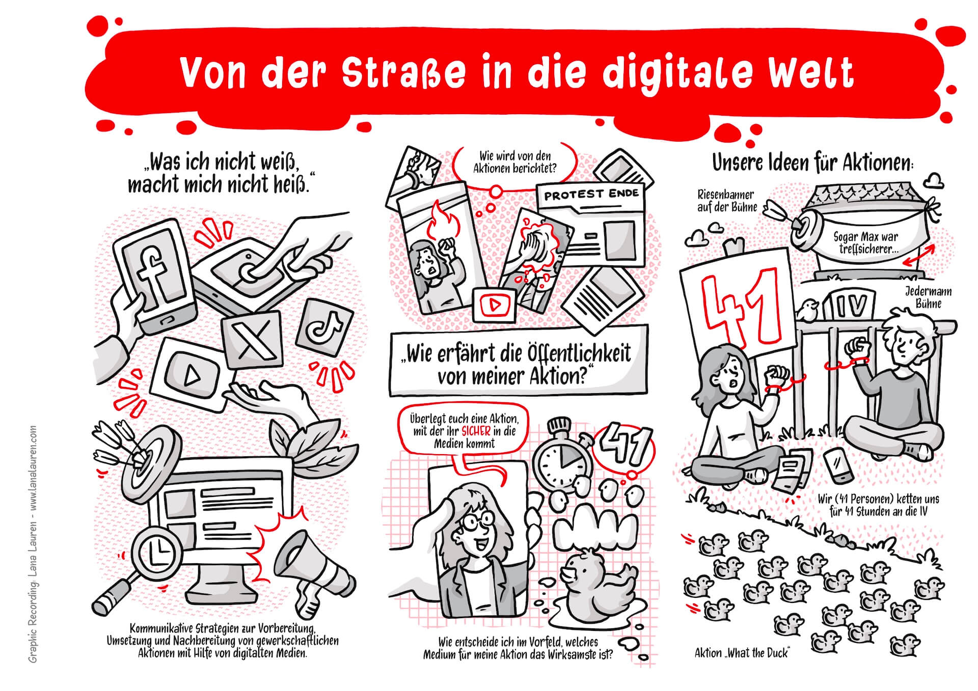 Ich habe das gesamte Event visuell begleitet und durfte in die nicht nur spannenden sondern auch sehr praxisnahen Workshops mit eintauchen. Die Illustrationen unterstützten nicht nur die Reflexion des Gelernten, sondern dienten auch als Abschluss und Zusammenfassung der Tagung und motivierten dazu, kreative Ansätze künftig auch im eigenen gewerkschaftlichen Kontext anzuwenden.